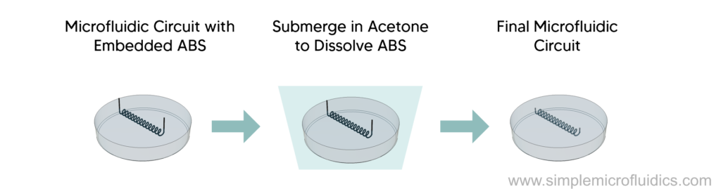 Once the resin cures, you can submerge it in acetone overnight to dissolve the ABS, leaving you with the final microfluidic circuit.