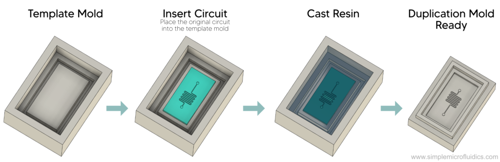 First, place the circuit on a flat surface in a container (called the template mold) and cast resin into it. Once the resin cures, it can be used as a duplication mold to reproduce the circuit you started out with. Just cast PDMS into the duplication mold to make a copy of your original circuit.