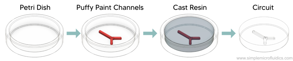 First let’s look at a top-level overview of what molding a microfluidic circuit means. Later in this article you will learn a couple of detailed ways of applying this broad principle to making microfluidic circuits for yourself.
