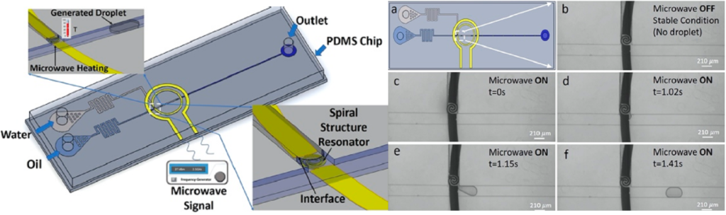 A team from The University of Waterloo investigated a new method for droplet generation in microfluidic devices. Droplets were generated using a microwave coil that supplied heat at the interface of the two liquids. Although this method doesn’t have a promising throughput, the droplets generated can be easily controlled and have rapid response times.