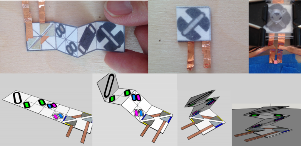 This paper demonstrates a folded battery fabricated using wax printed paper microfluidics. Aluminum and silver were embedded into the different layers of the circuit to create the two half cells to form a battery. A few ยตL of deionized water would then activate the postage stamp sized battery, supplying about 2.5 V for over 15 minutes – enough to power an LED. This battery only costs around $0.10 a piece to fabricate.