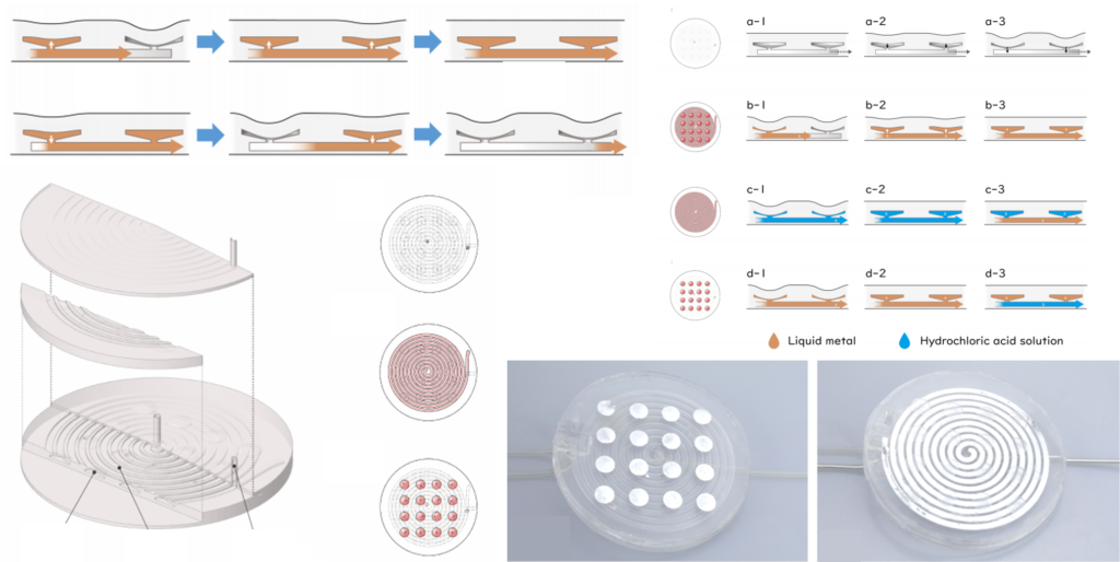 It achieves this by having a tri-layer construction comprising of a grid of chambers that sits on top of a spiral path connected by tunnels. Different fluids such as red ink or liquid metal can be filled in either the spiral, the chambers, or both. This changes the properties of the sensing unit allowing a wider flexibility for detecting inputs.